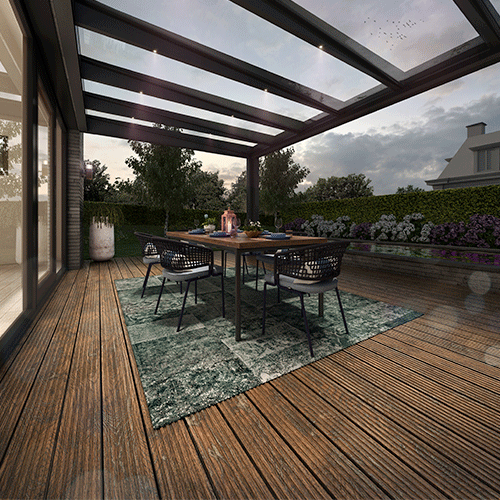 U kunt de Pallazzo Lounge eenvoudig combineren met de Pallazzo Invigo. Dit is een schuifwand die u met slechts één handbeweging kunt bedienen. De schuifbareelementen bieden niet alleen extra comfort tegen regen en wind, maar bieden ook maximale transparantie en uitzicht op de tuin.