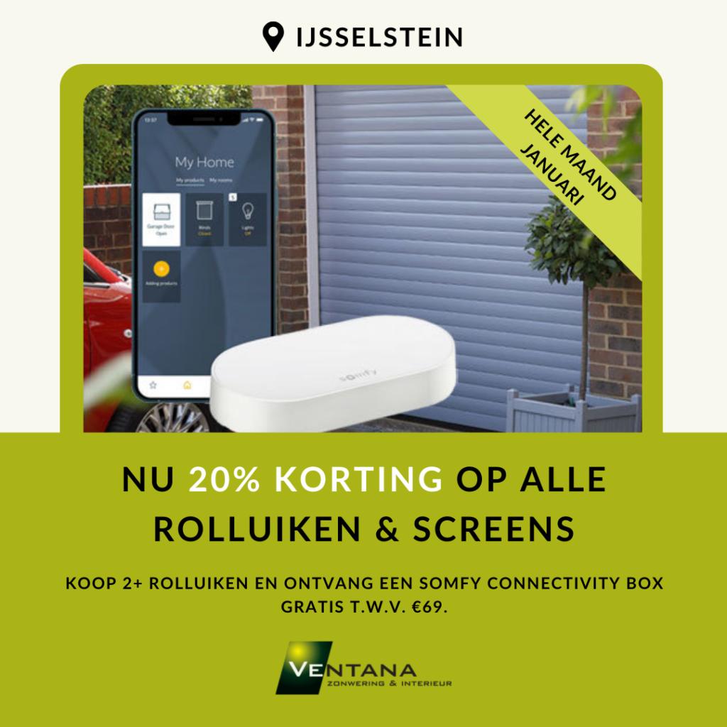 Nieuwjaarsactie: de gehele maand januari 20% korting op rolluiken en screens! Bij aankoop van 2 of meerdere rolluiken bovenop de 20% een extra gratis Somfy Connectiviteit Box t.w.v. €69,-.